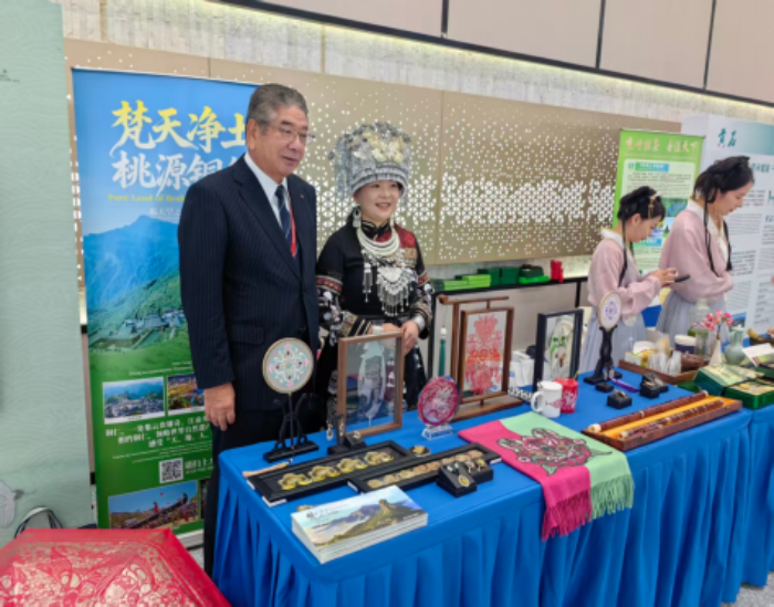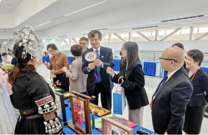 杨海燕身着苗族服装,向中外嘉宾介绍铜仁非遗文化、展示铜仁幼儿师范高等专科学校师生非遗文创作品。色彩绚丽的苗绣作品上,蝴蝶妈妈、祥云等经典图案栩栩如生,每一针每一线都凝聚着苗族先民的智慧与审美;思南剪纸展现的镂空技艺,让花鸟鱼虫、民俗故事在红纸上“活”了起来,不少日韩嘉宾驻足观看,不时发出赞叹;玉屏箫笛则以其温润的音色、精美的雕刻,成为文化交流的“声音名片”,吹奏时婉转悠扬的旋律穿透会场,让国外友人沉浸式感受中国传统乐器的魅力。