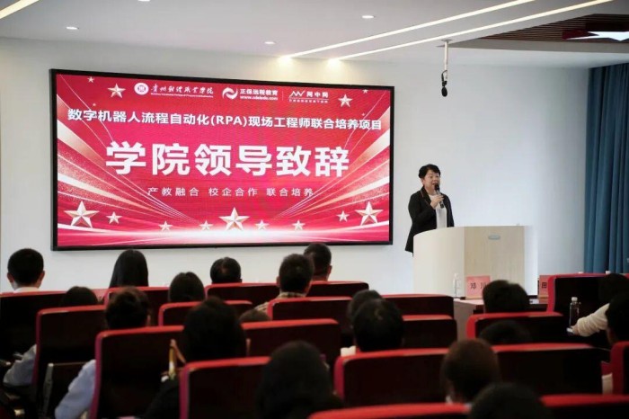 开班典礼上,邓川向合作企业正保集团致以诚挚感谢,并向获表彰同学表示热烈祝贺。她指出,产教融合是推动职业教育高质量发展的重要路径,面对大数据、人工智能技术的飞速发展,职业教育必须主动顺应数字化转型浪潮,为培养适配产业需求的高素质人才夯实基础。本次数字机器人流程自动化(RPA)现场工程师联合培养项目,是学院聚焦校企合作、产教融合、创新人才培养模式的重要实践。她强调,今后双方要深化合作,推动人才培养体系与行业发展、岗位需求同频共振,让职业教育精准对接产业需求、培养“能干事、干成事”的高素质技术技能人才。