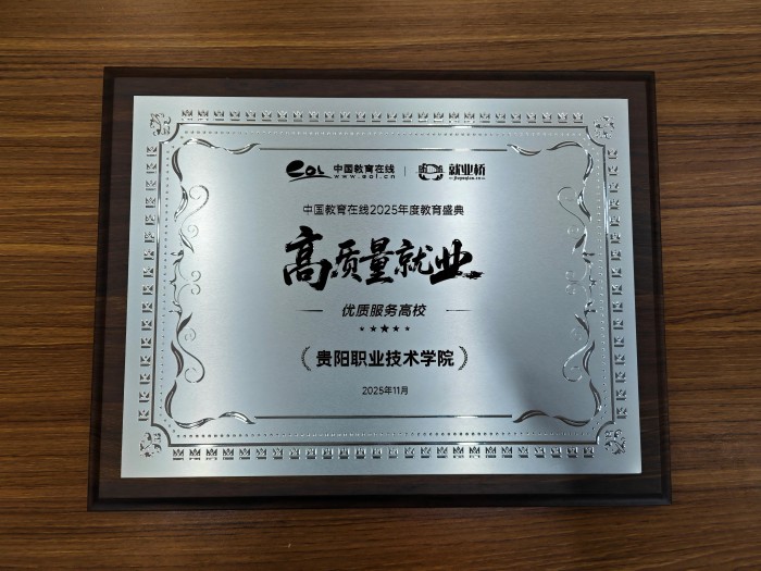 为深入贯彻党中央、国务院关于促进高校毕业生等青年就业创业的决策部署,落实《人力资源社会保障部 教育部 财政部关于做好2025年高校毕业生等青年就业工作的通知》等最新政策精神,挖掘和推广就业工作典型。中国教育在线·就业桥举办了“高质量就业”2025年度教育盛典活动,表彰高校就业工作数智化转型,创新实践的优秀案例,对推动高校就业跨越式发展,汇聚创新动力的榜样单位进行推广。贵阳职业技术学院将以此为力量源泉,探索就业发展的创新事迹,分享就业改革的有益经验,为高校毕业生高质量就业发展提供动力引领。