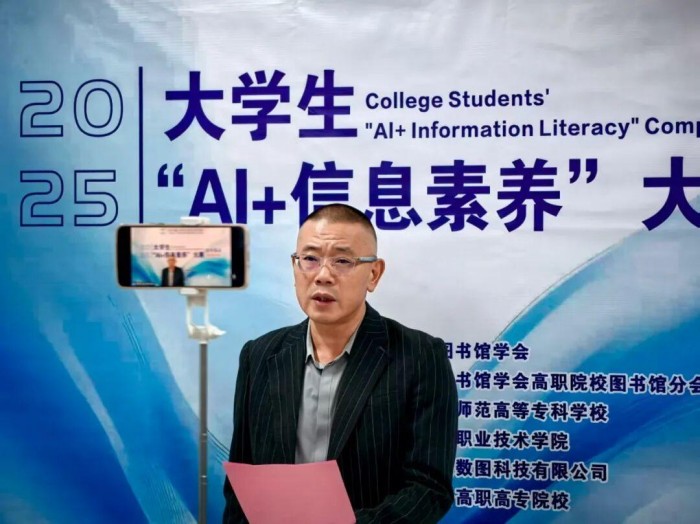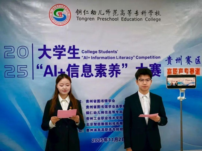 11月2日,2025年高职高专院校大学生“AI+信息素养”贵州赛区省赛以线上直播形式开赛,吸引了全省22所院校的132名学生参赛。铜仁幼儿师范高等专科学校党委委员、副校长杨会新通过线上致辞,信息中心主任、图书馆负责人邓政勇在直播主会场主持赛事,贵州省图书馆学会高职院校分会主任委员、贵州工业职业技术学院图书馆馆长赵荣凤及22所高职高专院校图书馆负责人及指导老师全程观赛。