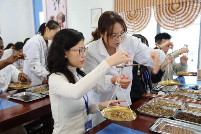 在贵州健康职业学院民族医药展览馆,国际留学生参观了民族中医药和道地药材。在中医药实训室,大家共同上中医药课程,认识中草药,了解中医药文化的起源,学习如何使用戥秤,品尝了中药奶茶,了解了中草药的药用知识,体验了制作香囊的乐趣。