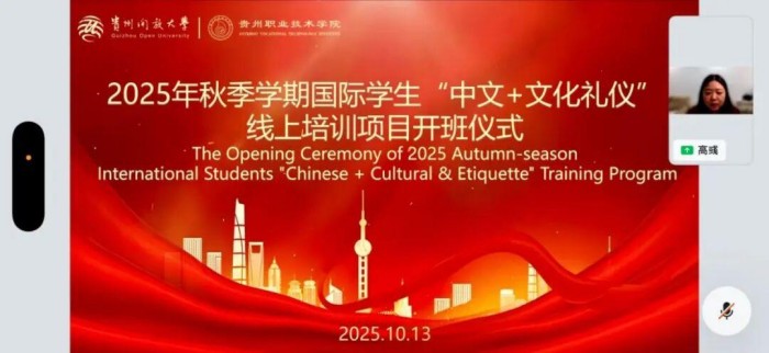 2025年10月13日晚,贵州开放大学(贵州职业技术学院)成功举办2025年秋季学期国际学生“中文+文化礼仪”线上培训项目开班仪式。来自越南、柬埔寨等国的学员、合作机构代表及学校教师云端相聚,共同开启新学期的文化学习之旅。