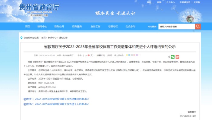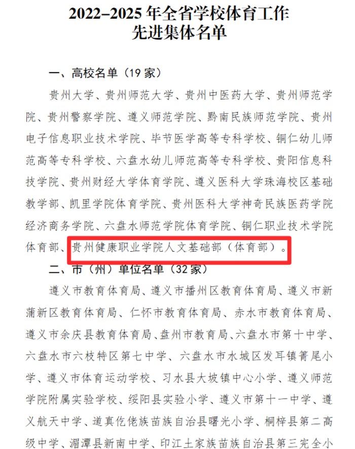 近日,贵州省教育厅公示2022—2025年全省学校体育工作先进集体和先进个人评选结果,贵州健康职业学院人文基础部(体育部)荣获“全省学校体育工作先进集体”称号,教师石忠瑜荣获“全省学校体育工作先进个人”称号。