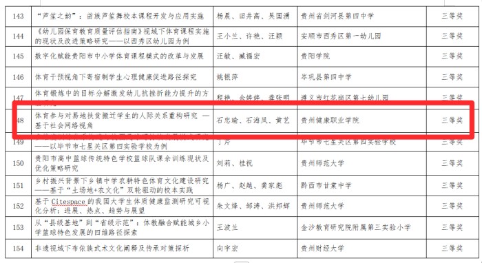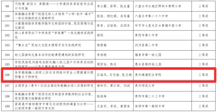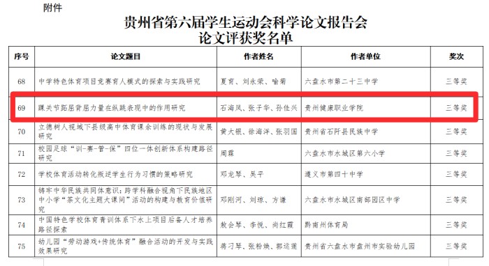 近日,贵州省第六届学生运动会科学论文报告会评选结果公布,贵州健康职业学院人文基础部(体育部)教师团队共有3篇论文荣获三等奖。
