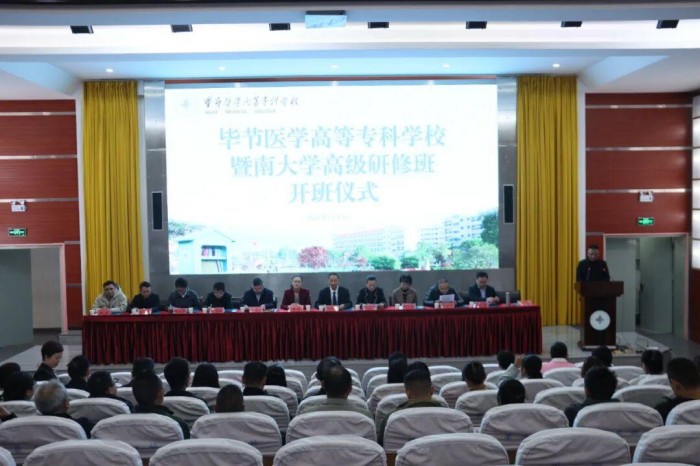 2025年11月4日上午,暨南大学高级研修班开班仪式在毕节医学高等专科学校培训中心一楼会议室举行。暨南大学医学部、毕节市侨联、毕节市教育局、毕节市卫健局、毕节市中医院、毕节市紧急救援中心有关领导莅临会议。毕节医学高等专科学校党委书记张体江出席会议并致辞。会议由毕节医学高等专科学校党委委员、副校长许海主持。