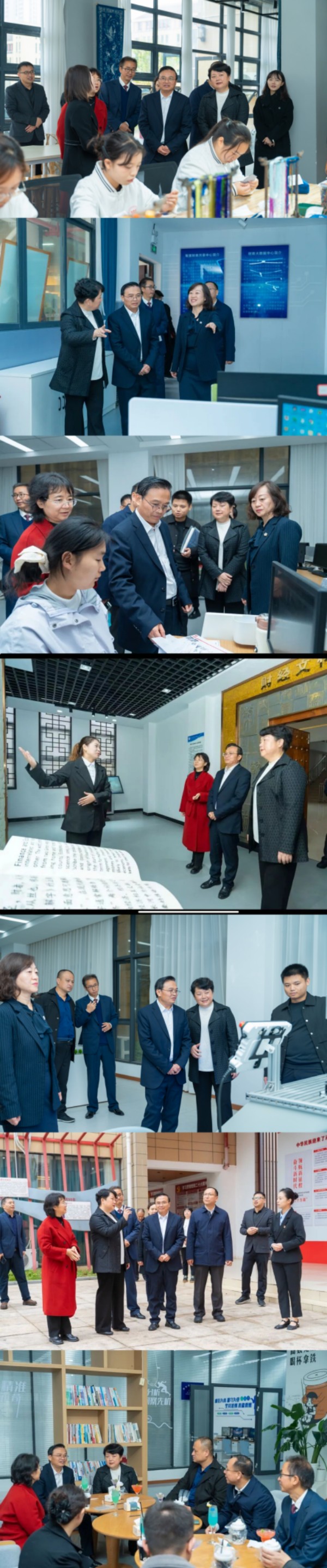 会后,在学院领导陪同下,与会领导嘉宾实地考察了学院财经文化馆、非遗传承及美育协同创新中心、专业实训基地等场所,与一线教师、实训学生亲切交谈,详细了解产教融合、科研实践等情况,对学院发展成就给予高度肯定。