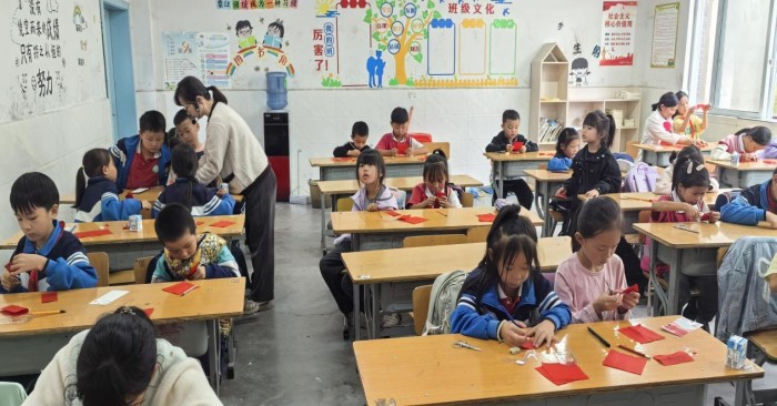 手工课支教老师张爱粉则将苗族文化与环保理念深度融合:“松桃是苗族聚居地,‘蝴蝶妈妈’是民族文化符号。我们用废旧彩纸、纸箱剪刻苗族银饰、蝴蝶妈妈等纹样,既让孩子学会手工技能,又能了解传统文化,还能树立环保意识。有个孩子课后说要把家里的旧布料带来做苗族服饰手工作品,这种‘润物细无声’的引导,比单纯说教管用多了。”