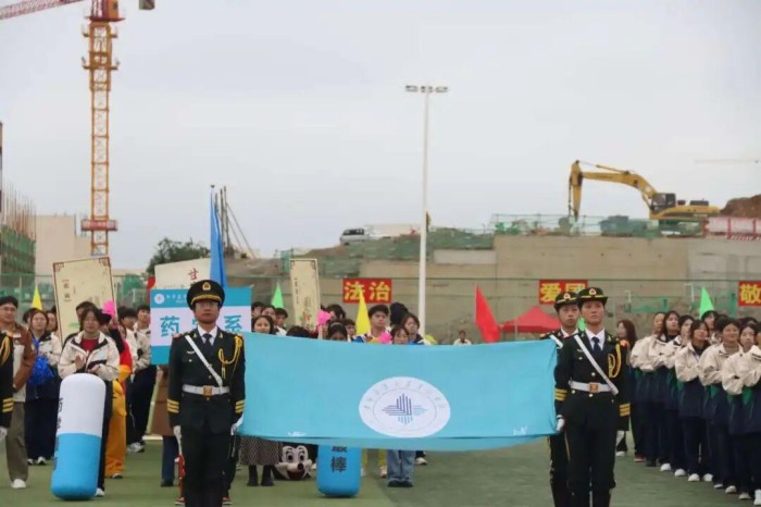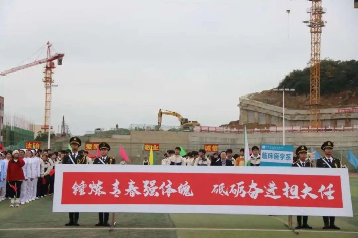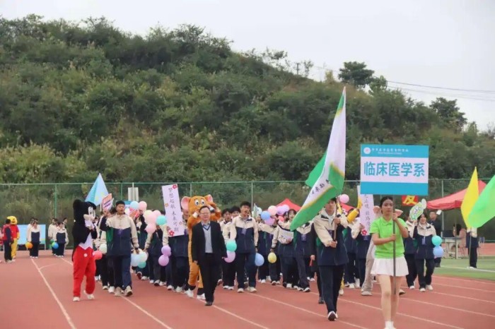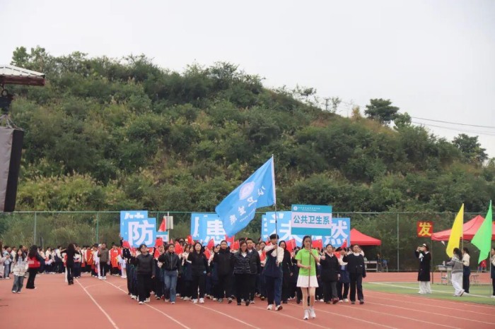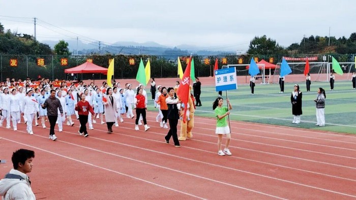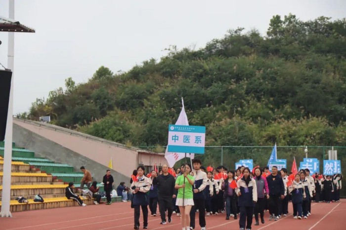 开幕式现场,伴随着激昂的《运动员进行曲》,国旗护卫队迈着铿锵步伐率先入场,鲜红国旗迎风招展,展现着奋进的力量,挺拔的身姿尽显奋进力量;随后,彩旗队、裁判方队依次登场,斑斓旗帜与整齐队列相映成趣,尽显昂扬风貌;各系代表队身着特色服饰,以精心编排的口号与队形走过主席台,创意展示赢得阵阵掌声,生动展现了医学生的活力与团结向上的精神。