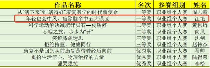 在职业组个人赛中,江艳老师的《年轻也会中风,破除脑卒中五大误区》,以精准的知识解读、清晰的逻辑架构和富有感染力的现场表达,成功斩获一等奖。演讲中,江艳老师针对大众对脑卒中“年轻化”认知不足、预防意识薄弱等痛点,深入浅出地讲解脑卒中的早期识别、科学预防与康复要点,为青年群体敲响健康警钟,展现了康复专任教师扎实的专业素养与优秀的科普传播能力。