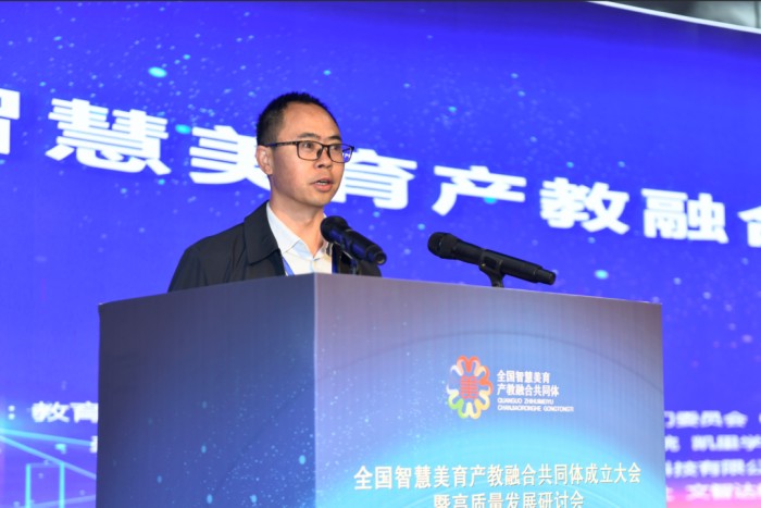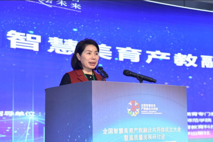 重庆智慧美育教育科技有限公司董事长唐小慧作为企业代表致辞。她分享了公司在智慧美育评价与实践领域的探索,特别是与铜仁幼儿师范高等专科学校合作研发高职院校数字化美育评价平台的成功经验,并表示将深度参与共同体后续建设工作,助力美育成果转化与产业应用。