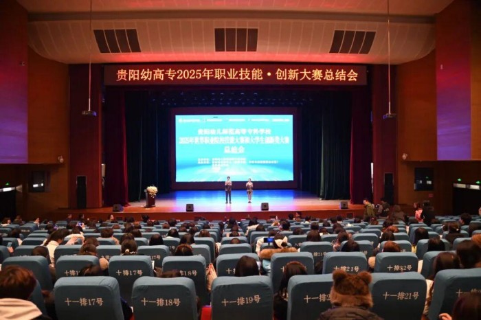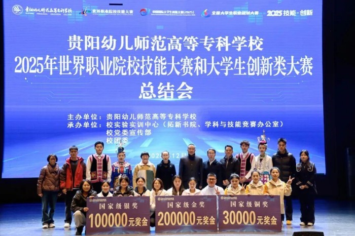 为全面贯彻党的教育方针,落实全国职业教育大会精神,大力弘扬劳动光荣、技能宝贵、创造伟大的时代风尚,推动新时代工匠精神培育与学校办学理念、人才培养目标深度融合,2025年12月5日,贵阳幼儿师范高等专科学校举办2025年世界职业院校技能大赛及大学生创新类大赛总结会。校党委书记李华荣,校党委副书记、校长任洁,校党委委员、副校长潘丽芬,校党委委员、纪委书记陈尧年,校党委委员、副校长王松出席活动;各系(部)负责人、党总支书记、大赛获奖团队指导教师、学生参赛队伍代表,以及学前教育与早期教育系、特殊教育系、艺术系、社会工作系、体育与健康系的学生代表参会。