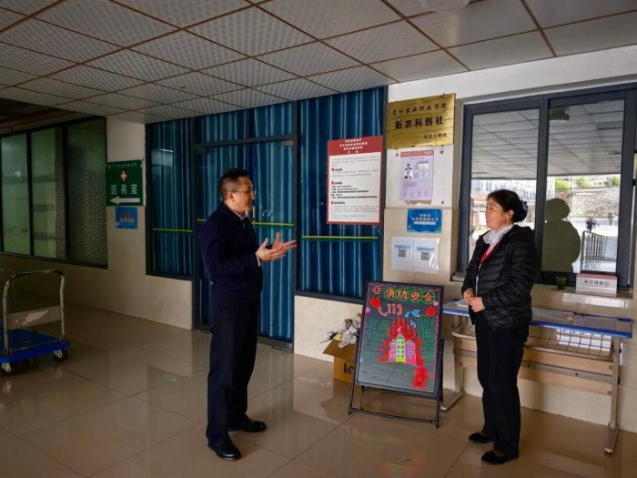 在学生公寓,汪卫红通过实地查看、与宿舍管理员交流、查阅记录等方式,深入了解 “一站式”学生社区建设、医务室服务、学生超市运营及日常学生管理等工作。他代表学院党委,向辛勤付出的物业管理人员表示感谢,指出学生公寓是学生学习生活的重要场所,安全工作容不得半点松懈,希望物业工作人员继续坚守岗位、尽心尽责,为学生营造安全、舒适的住宿环境。