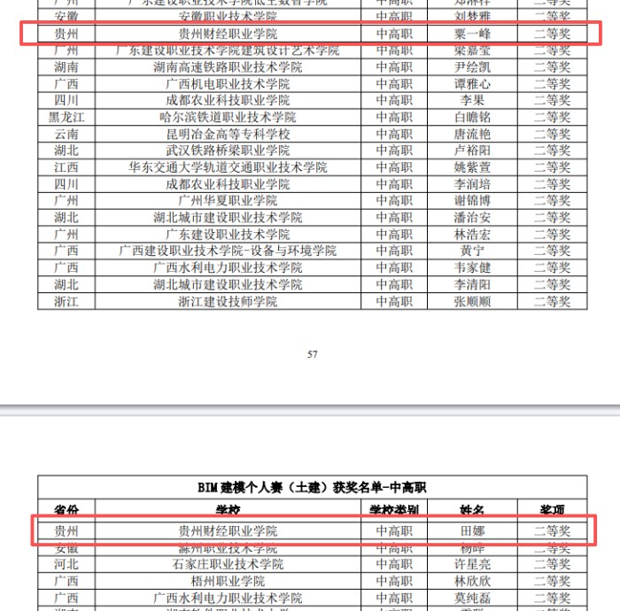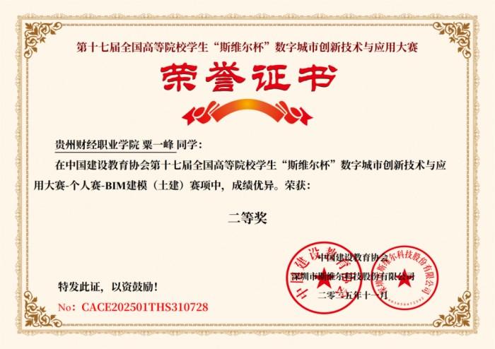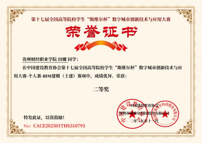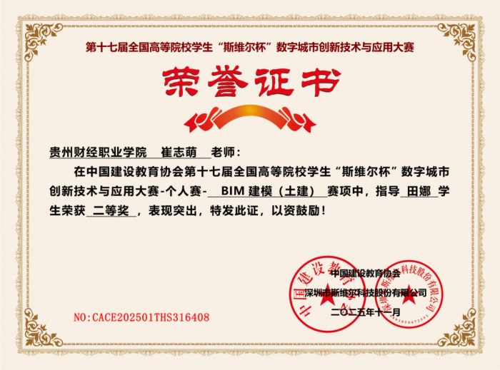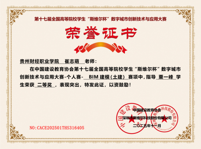 贵州财经职业学院财政金融系工程造价专业粟一峰、田娜斩获第十七届“斯维尔杯”BIM建模(土建)赛项全国二等奖