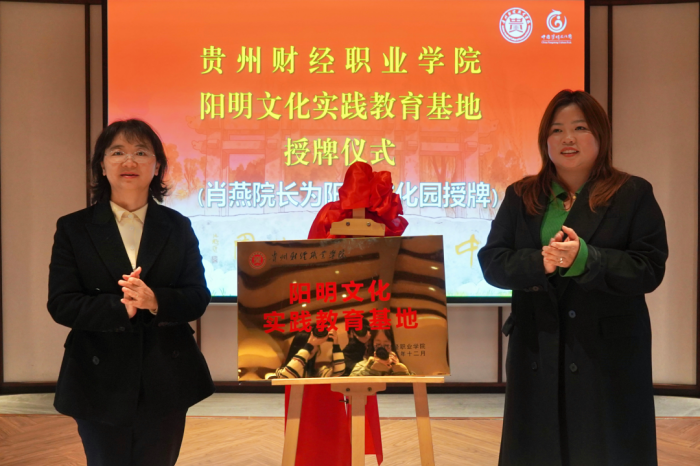 随后,赵典友与肖燕共同签订了校外实践教学基地合作协议,肖燕与修文阳明文化管理有限公司副总经理陈瑜共同为“贵州财经职业学院阳明文化实践教育基地”揭牌。