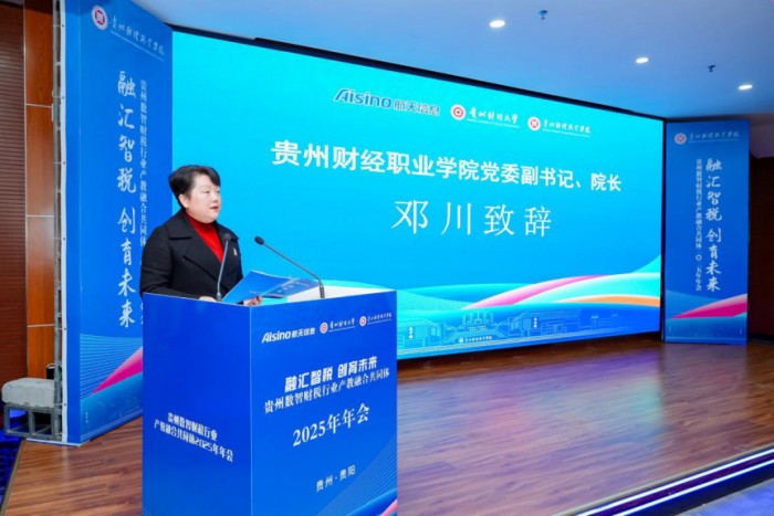 贵州财经职业学院党委副书记、院长邓川在会上致辞,向莅临盛会的领导、嘉宾及各界同仁表示欢迎与感谢。她强调,产教融合是深刻的育人变革,高职院校与企业需打破壁垒,协同破解项目转课题、技术进课堂、标准接需求等核心命题。为此,她提出三点倡议:一是深耕“融”的维度,探索协同育人新范式;二是聚焦“新”的领域,构筑人才培养新高地;三是笃行“人”的根本,培育复合型财税人才。