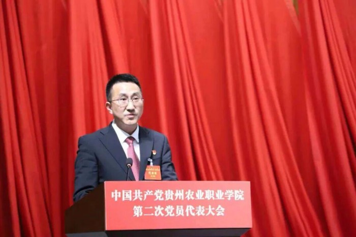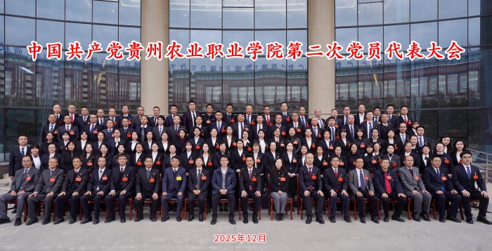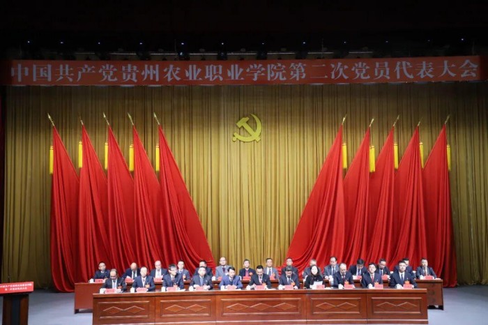带着深耕农业职业教育的初心、带着服务乡村振兴战略的使命,中国共产党贵州农业职业学院第二次党员代表大会顺利召开,会场内洋溢着热烈庄重、团结奋进的浓厚氛围。主席台正中,中国共产党党徽在鲜艳红旗的簇拥下熠熠生辉,璀璨的光芒映照着全体党代表勠力前行的昂扬风貌;会场悬挂着“高举旗帜凝心铸魂,担当使命砥砺前行,为建设特色鲜明的高水平职业院校而团结奋斗”的会标。
