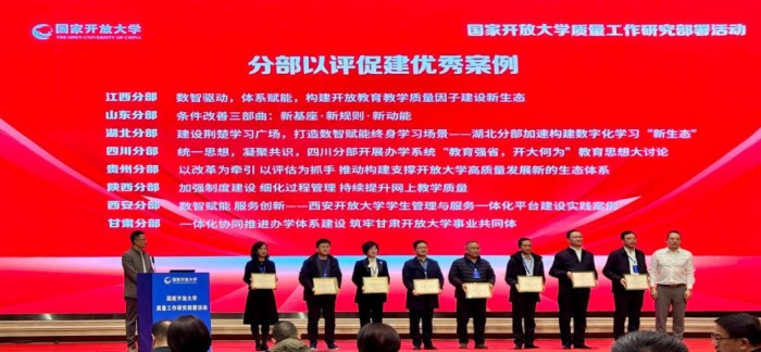 参会期间,贵州开放大学积极参与质量治理研讨,分享了提质经验。会议还对国家开放大学首轮分部评估优秀案例进行了颁奖,贵州开放大学《以改革为牵引以评估为抓手推动构建支撑开放大学高质量发展新的生态体系》案例及安顺开放大学《以实践赋能成长以创新引领发展推动构建“三级联动”实践育人模式》案例被评为优秀案例。