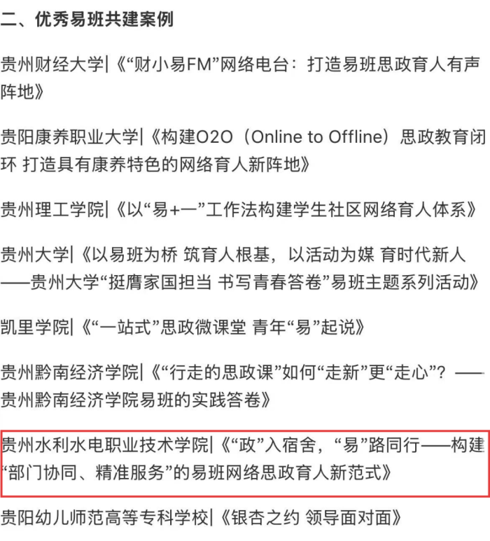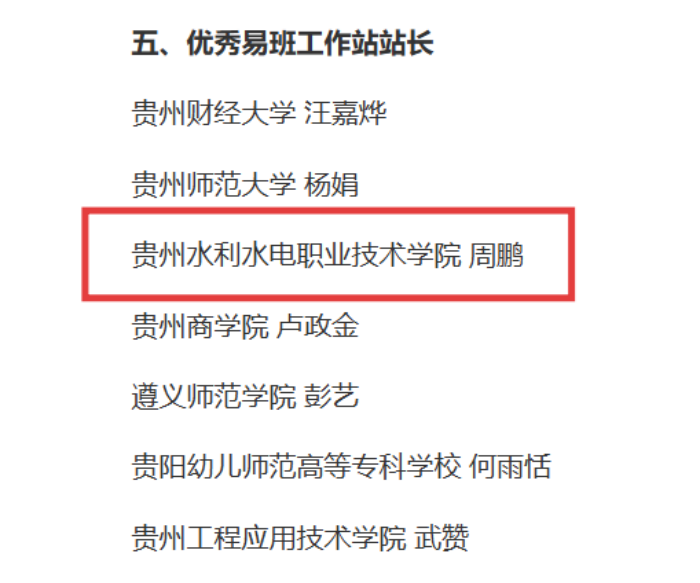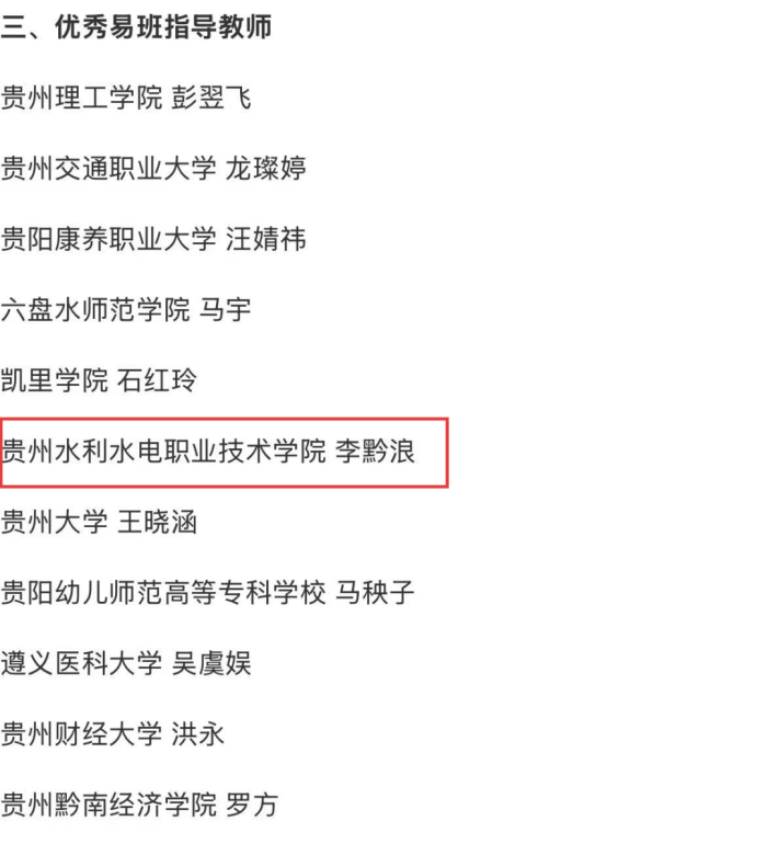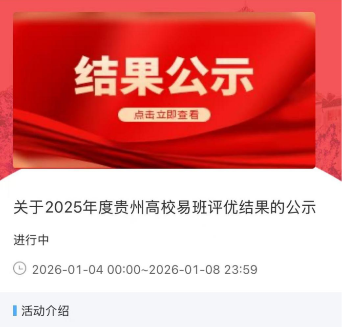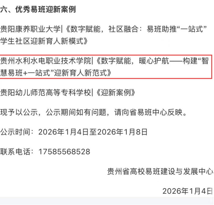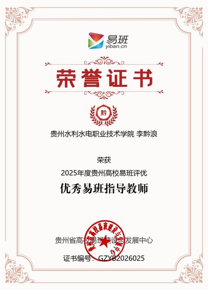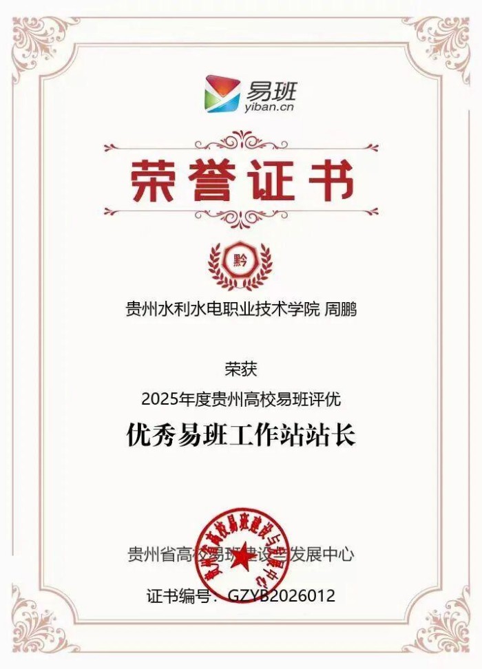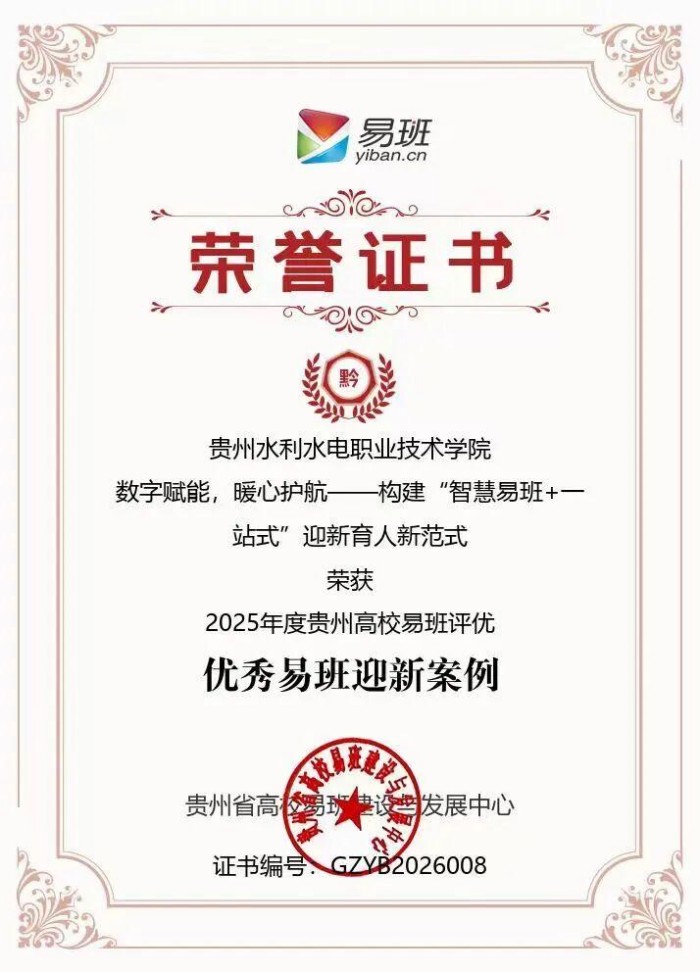 近日,贵州省高校易班建设与发展中心发布了《关于2025年度贵州高校易班评优结果的公示》。贵州水利水电职业技术学院在本次评选中表现突出,荣获2025年度贵州省优秀易班共建案例、优秀易班指导教师、优秀易班工作站站长、优秀易班迎新案例共四项省级荣誉。此次获奖是省易班发展中心对贵州水利水电职业技术学院易班建设工作的充分肯定,也是全院师生共同努力、持续深耕网络育人的成果体现。