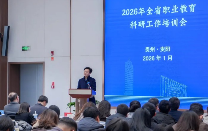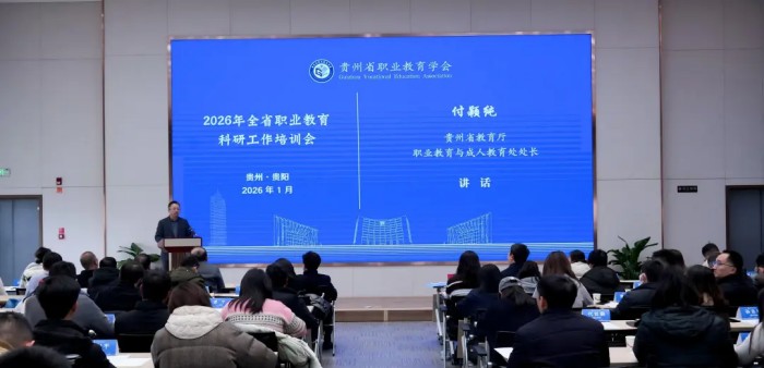 1月12日,2026年全省职业教育科研工作培训会在贵州职业技术学院举行。会议由贵州省职业教育学会主办,省教育厅职成教处处长付颖纯,省职业教育学会执行会长、学校党委副书记、校长罗勇等领导嘉宾出席活动,全省2025年度职业教育科研课题负责人及相关代表参会。会议由学会副会长张雪丽主持。