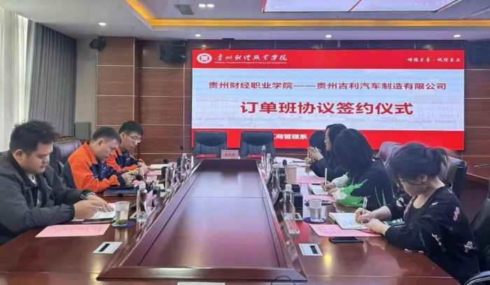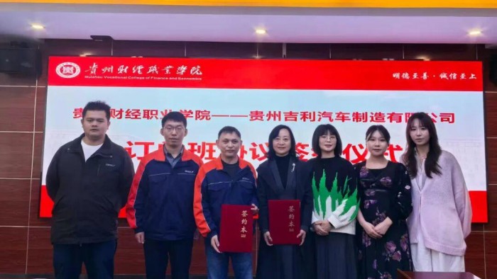 为深化校企双向赋能,精准对接企业用人需求,打通学生就业与企业人才输送的“最后一公里”,3月25日,贵州财经职业学院工商管理系与贵州吉利汽车制造有限公司“吉利汽车订单班”签约仪式在学院顺利举行。学院党委委员、副院长杨莉,吉利汽车供应链总监周广宇,以及校企双方相关部门负责人、专业教师代表共同出席本次活动。