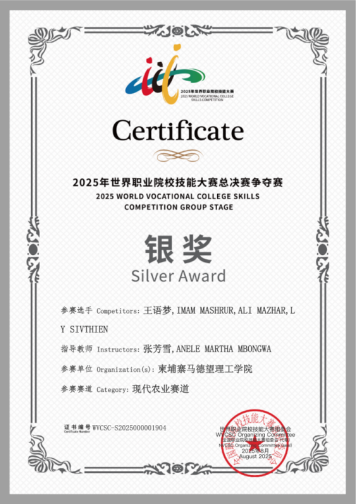 近日,2025年世界职业院校技能大赛总决赛争夺赛赛场再传捷报!贵州水利水电职业技术学院留学生参赛团队以精湛专业技能、默契跨国协作,在全国强手如林的激烈角逐中奋勇争先、脱颖而出,成功摘得银奖,为学院再添一项重量级国际赛事荣誉。
