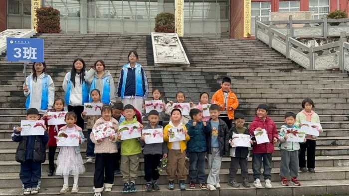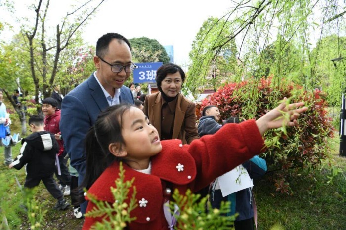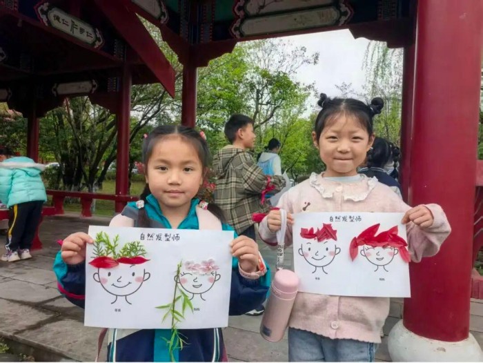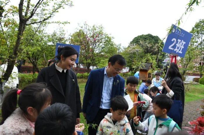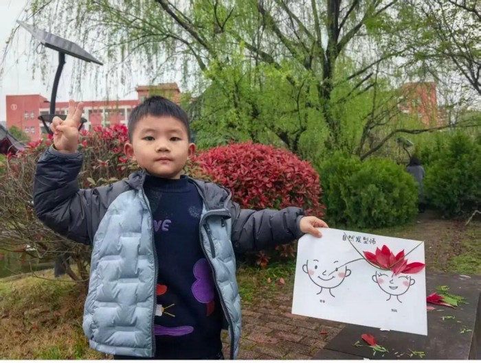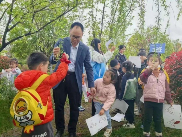 开班仪式后,校领导们化身“孩子王”,带领孩子们走进校园静心湖畔,一起认识大自然。柳树发了新芽,樱花开了满枝,湖里的锦鲤悠闲游弋……“这是香樟树,它的叶子可以驱虫哦!”“快看,那只小鸟在筑巢!”校党委书记宋选文蹲下身,耐心地为孩子们讲解每一种植物的名字和特点,还和孩子们一起捡拾落叶、花瓣等,为接下来的植物贴画收集素材。