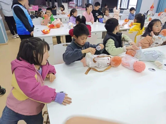 VR实训室里,姚灯明、李梅老师带着小朋友们“飞”上贵州的天空,看黄果树瀑布的壮阔、西江苗寨的秀美,孩子们伸手去抓虚拟的蝴蝶,尖叫声此起彼伏;婴儿照护实训室,杨娟老师让7—9岁的孩子抱着模拟婴儿,学习喂奶、拍嗝、换尿布等。“原来爸爸妈妈照顾我这么辛苦!”一个小男孩认真地给“宝宝”盖好被子;非遗中心剪纸教室,李晓雪、骆玉婷老师教孩子们用卡纸和订书机编小船,大孩子做得又快又好,还主动帮小弟弟小妹妹按订书机;书法教室里,徐佳澐老师根据不同年龄准备练习内容,4岁娃描红“人”字,10岁娃临摹“春”字,写完还要排队洗手,仪式感拉满;篮球场上,体育老师陈春带着孩子们跳绳、玩团队游戏,跑得满头大汗却谁也不肯停下……