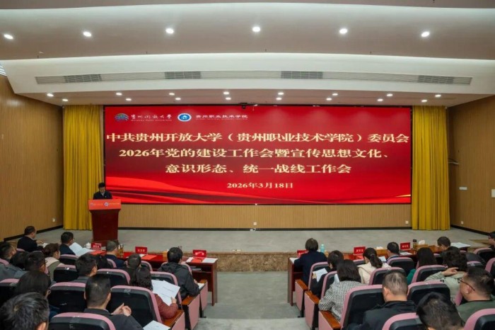 3月18日,贵州开大(贵州职院)召开2026年党的建设工作会暨宣传思想文化、意识形态、统一战线工作会。全体在家校领导、党委常委班子成员、副科级以上干部、二级学院(部)党支部书记代表出席会议。会议由党委副书记、校长罗勇主持。