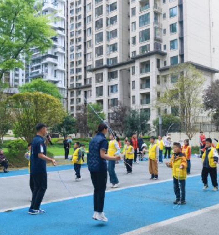为丰富学生春假生活,促进青少年身心健康发展,2026年春假期间,贵阳幼儿师范高等专科学校体育与健康系组织师生走进清镇市滨湖社区,开展主题为“放下小书包,花儿对我笑”的跳绳联动活动。本次活动充分发挥“校、社、企、政”四方协同优势,学校提供专业技术指导与志愿者团队,社区搭建活动平台并组织居民参与,企业出具跳绳器材健康数据服务,清镇市团委等部门给予政策支持与场地协调,形成了资源共享、优势互补的联动机制,为社区青少年打造了一个健康、快乐、有意义的春假体育课堂。