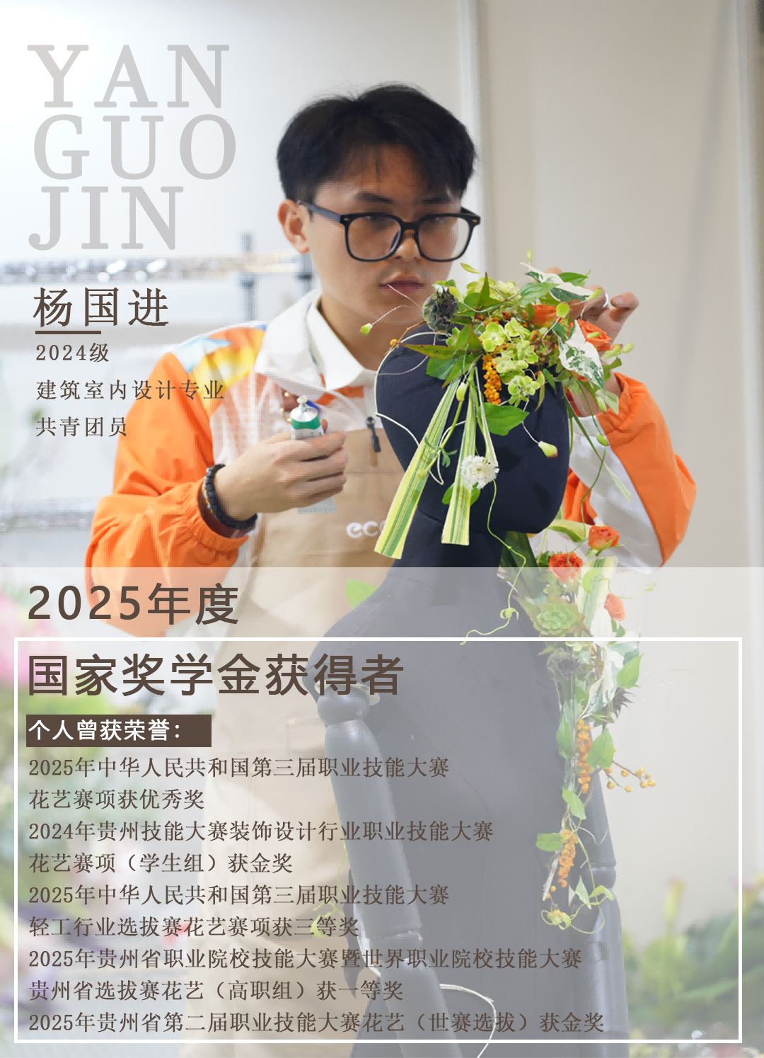 收获荣誉并未让他止步。为突破瓶颈、迈向更高水平,杨国进与教练深入分析作品、总结经验,主动走出校园,跟随教练外出观摩赛事、与各地花艺高手同台切磋。在交流比拼中拓宽视野、吸收新思路,专业水平实现质的飞跃。2025年在贵州省第二届职业技能大赛花艺(世赛选拔)中再次成功夺得该项目的金牌,成功晋级国赛资格。