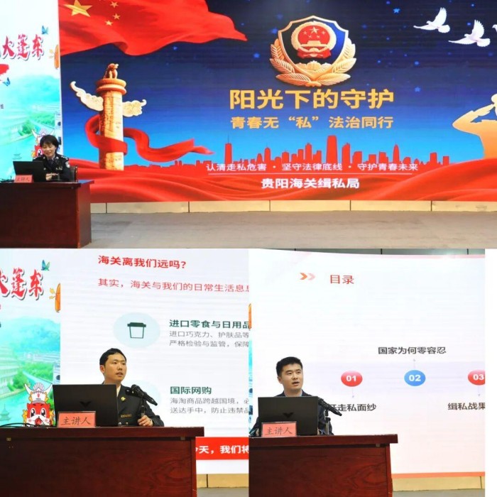 在创意赛事之外,沉浸式普法宣讲同步开展。贵阳海关缉私局民警及铜仁海关关员围绕海关业务知识、打击海南离岛免税"套代购"走私、禁毒反走私三大主题,为师生带来专题法治宣讲。透过典型案例剖析、现场互动问答、法律条文解读等方式,深入浅出讲解走私行为的法律后果与社会危害,引导广大师生知法于心、守法于行。