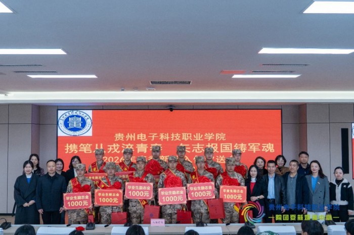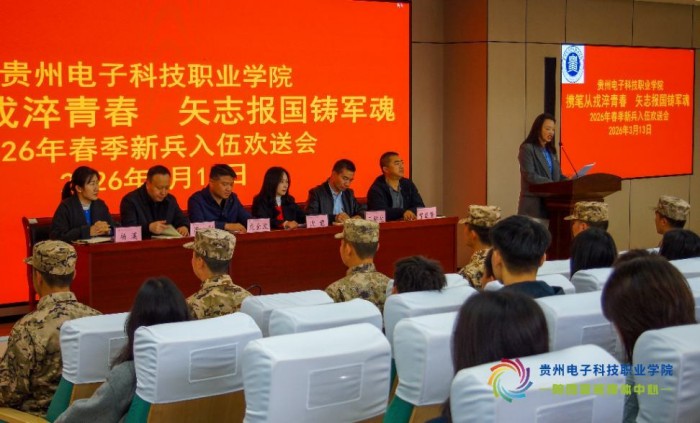 春风送暖,征帆催发。3月13日,贵州电子科技职业学院在凌飞坊四楼会议室举行2026年春季新兵入伍欢送会,为即将奔赴军营、投身强军事业、开启保家卫国光荣旅程的12名优秀学子送行。学院党委委员、副院长沈慧出席。