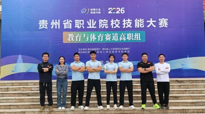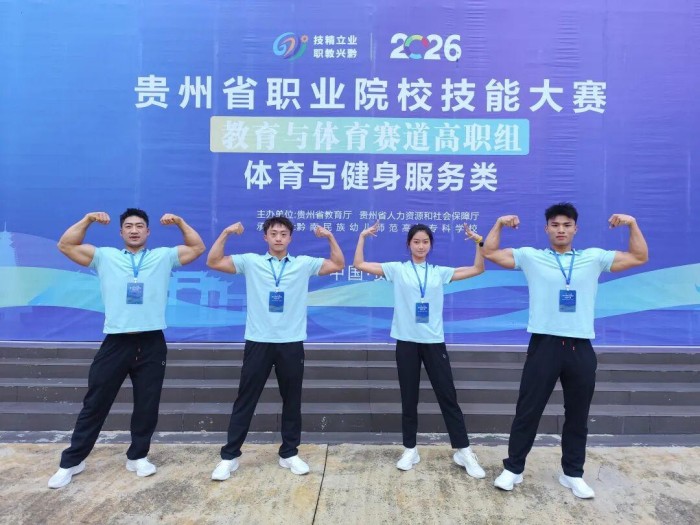 近日,2026年贵州省职业院校技能大赛教育与体育赛道(体育与健身服务类赛项)圆满落幕,铜仁幼儿师范高等专科学校体育与健康系王爽爽(社体A2301)、陈翠志(社体A2401)、罗龙(社体A2401)、曹卫宁(体教A2501)四位同学,与来自全省20所高职院校的25支代表队同台竞技,凭借出色发挥,以小组第一名的成绩强势晋级,并在赛道复评阶段从教育与体育赛道3个赛项7个平行组中脱颖而出,勇夺教育与体育小组第一名,成功斩获世界职业院校技能大赛参赛资格。