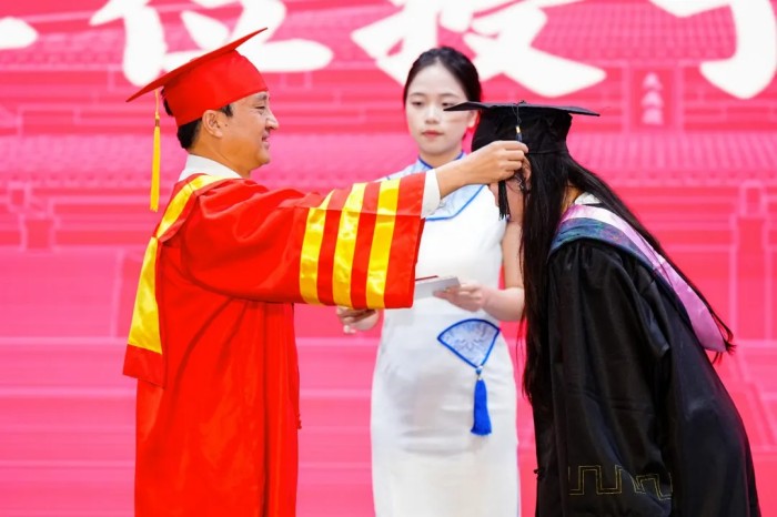 明伦堂内,开学典礼简约庄重,学校领导、各界嘉宾为新生代表佩戴校徽,表彰了优秀毕业生表彰、颁发了奖学金。新生与优秀毕业生代表分享感悟,传递奋进力量。