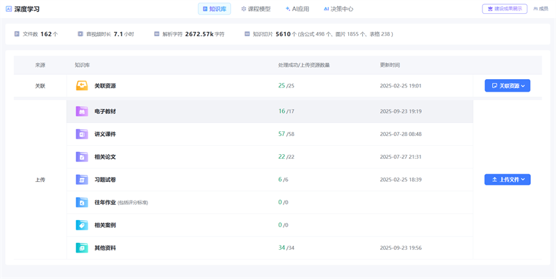 课程团队对教学资源进行了全面、深入地梳理与整合,精心构建了课程专属知识库。该知识库汇聚了教材、课件、前沿研究资料、实际应用案例等海量资源,总解析字符超百万,形成了众多知识切片。在此基础上,团队构建了课程检索增强模型,有效提升了智能学伴等AI工具生成内容的准确性,确保学生获取的知识权威、可靠。