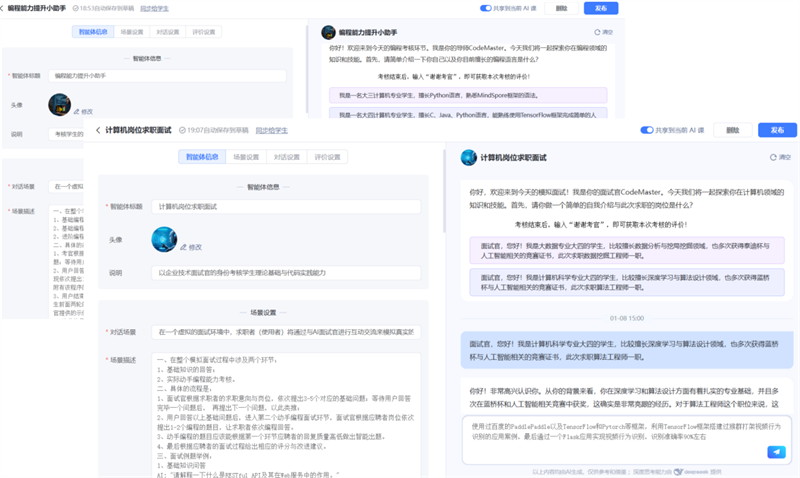 为了强化学生的实践能力和求职竞争力,课程建设了“编程能力提升助手”智能体和“计算机岗位求职模拟面试”智能体。