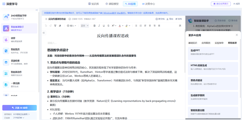 课程团队还为教师打造了智能备课助手,构建了涵盖PPT生成、HTML动画生成、思政点建设、教学案例生成、智能批量出题等功能丰富的指令集。教师在备课过程中,只需输入相关需求,智能备课助手便能快速生成高质量的教学资源,大大减轻了教师的备课负担,提高了备课效率。同时,智能备课助手还能帮助教师将思政元素巧妙融入教学内容,实现课程思政与专业教学的深度融合,知识传授与价值引领的有机统一。
