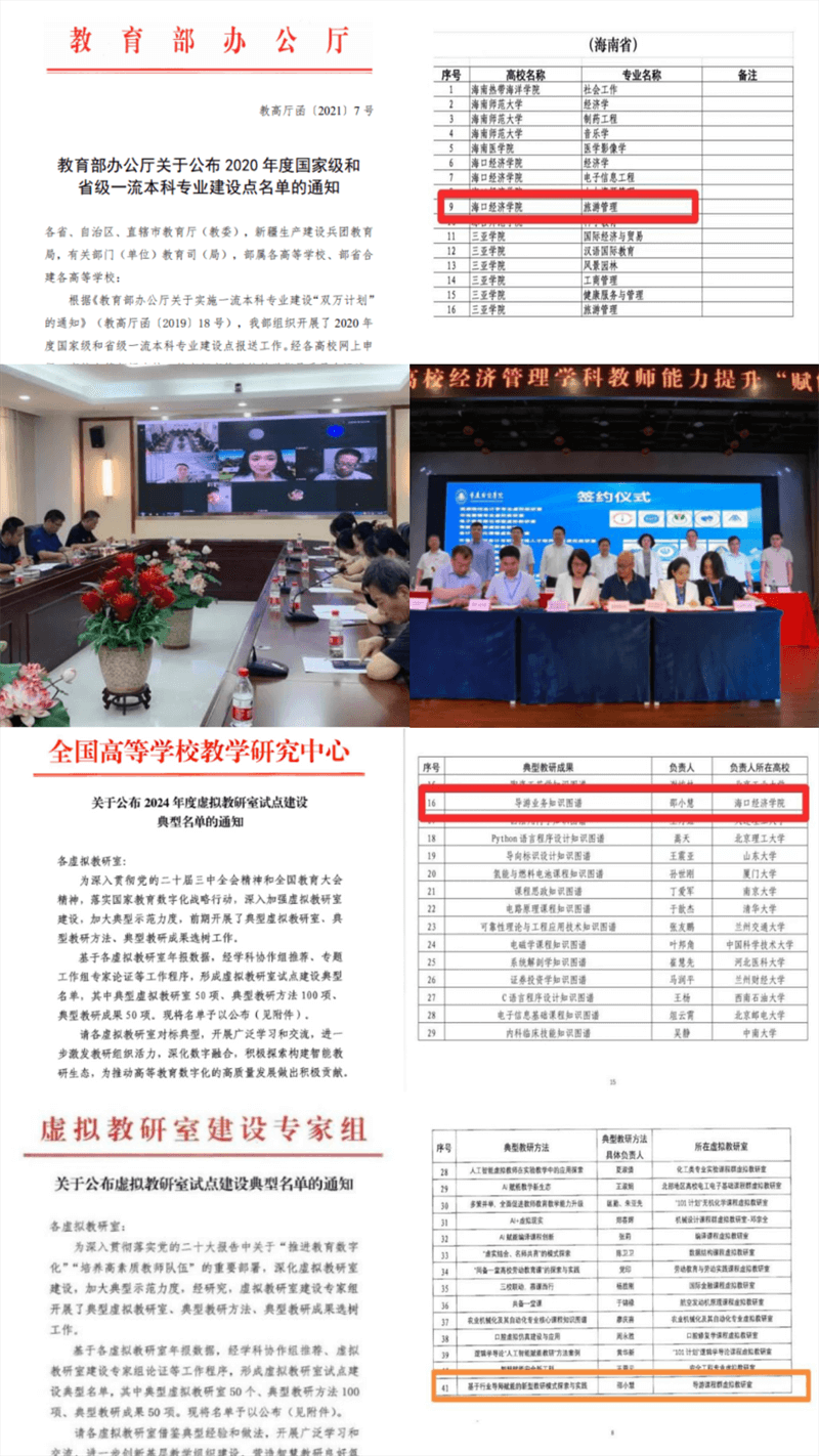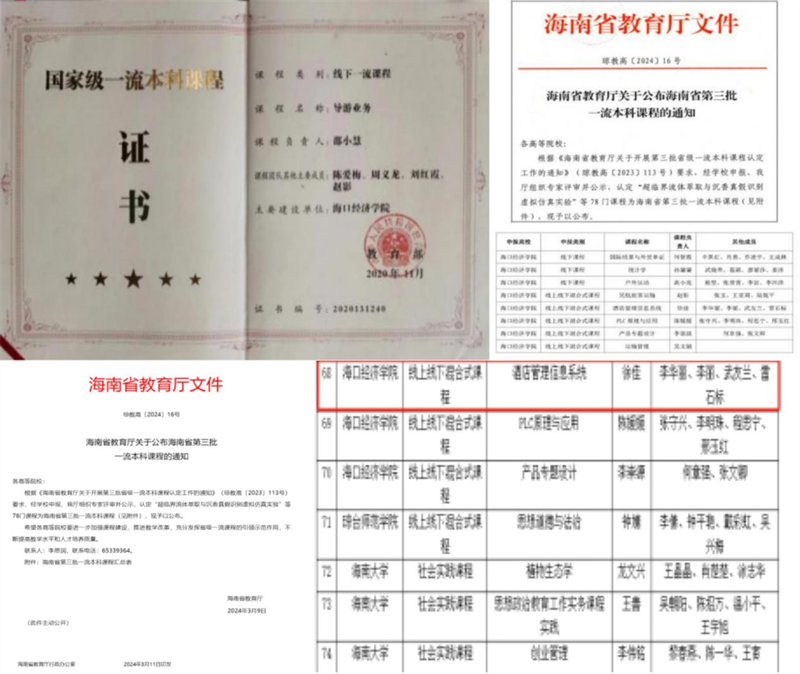 课程体系完善,质量标杆树立。课程建设作为人才培养的核心载体,学院全面推进国家级、省级、校级“三个一流”课程体系建设,筑牢高质量教学根基。《导游业务》于2020年11月成功入选国家级一流本科课程,《民航旅客运输》等7门课程获批海南省一流本科课程,《飞机计划与装载平衡》等27门课程获评校级一流课程,形成“国家级引领、省级支撑、校级全覆盖”的课程建设格局。