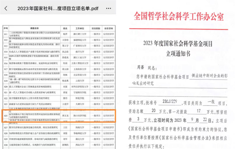 科研突破显著,服务地方有力。科研创新成果丰硕,累计出版学术著作19部、教材31部,发表学术论文371篇,其中核心期刊论文55篇、SSCI论文8篇;建成“海南省旅游商品研究基地”“海口人文与经济研究基地”两大省级科研平台,持续为地方文旅产业发展提供智力支持与决策参考。国家级科研项目实现历史性跨越,周义龙教授主持的《新发展格局下吸引境外医疗消费回流协同治理框架构建与政策路径选择研究》(编号:23BJY138)、周蔷博士主持的《供应链中断对企业影响及应对研究》(编号:23BJY229)两项课题成功获批国家社科基金项目,填补了学院国家级科研项目的空白。近五年共承担省级科研项目23项、厅级项目5项、市级项目43项,科研服务地方经济社会发展的能力持续增强。