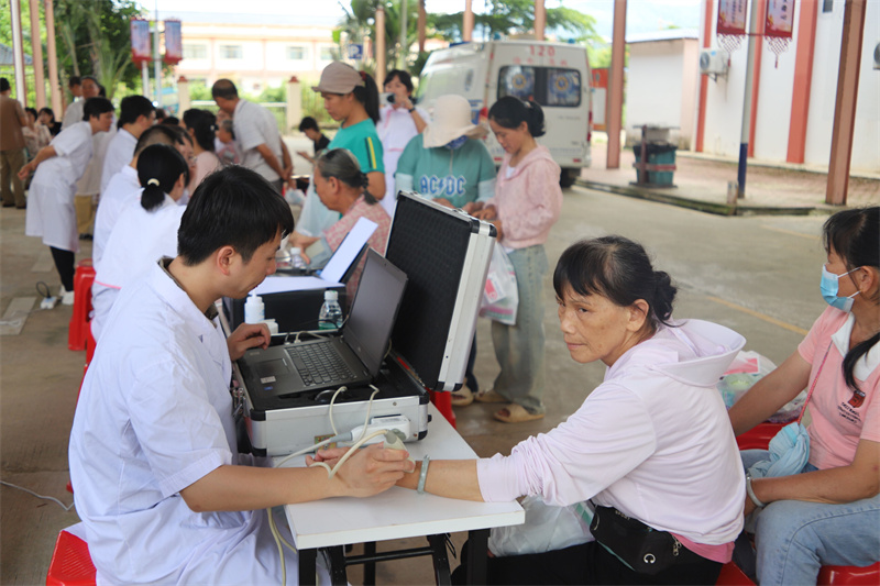 在水满乡卫生院,来自第一附属医院、各民主党派和学校侨联的14位专家组成的医疗团队,开展了涵盖骨科、内科、外科、中医科、妇产科、检验等多学科的联合义诊活动,为当地群众提供了甲状腺功能评估、骨科疾病诊断、超声检查以及健康咨询与指导等多方位医疗服务,并现场为群众赠送了二十余类非处方药。