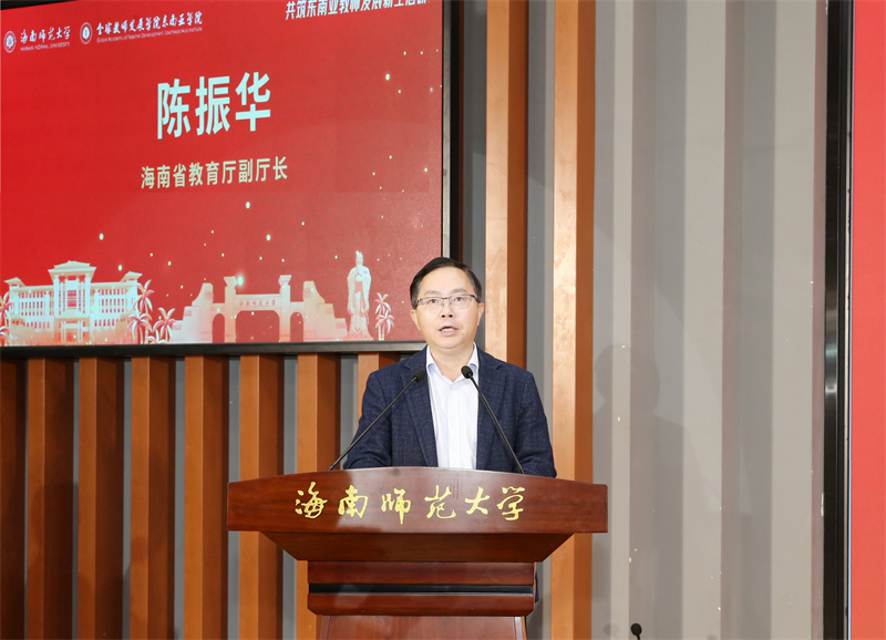 黄小华在致辞中指出,全球教师发展学院东南亚学院落户海南师范大学,是政策红利与办学优势的精准契合,是服务教育强国战略、深化中国-东南亚教育合作,落实“周边是首要”外交战略的生动实践。希望学校勇当教育开放先行者,努力探索区域协同新模式,以数字赋能教师专业发展,积极参与和推动区域性全球性教师教育标准与评价体系的对话合作,为构建人类命运共同体贡献教育力量。