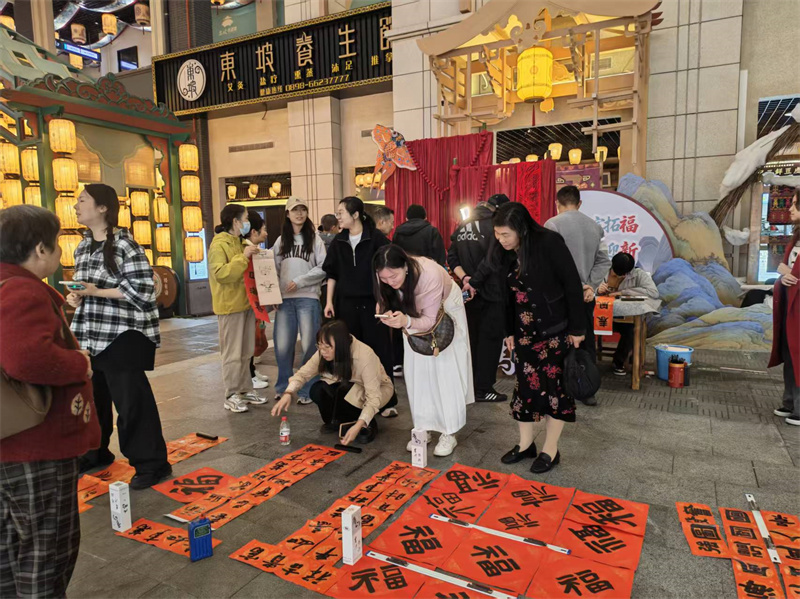 在活动现场,留学生们执笔凝神,将课堂所学书法技艺倾注于一笔一画之中。缅甸籍学生曲美丽书写的“马曜神州”笔画流畅、充满生气;泰国籍学生吴晓明书写的“八骏迎春”结构端庄如松立,笔意舒展似云流。在老师的指导下,留学生们创作了多副寓意美好的春联,如“春返神州舒画卷,马腾盛世入诗篇”“天地和顺家添财,平安如意人多福”等。大家将写好的春联和“福”字赠送给市民游客,并与他们热情交流贴春联、守岁等春节习俗,现场洋溢着温馨愉悦的气氛。