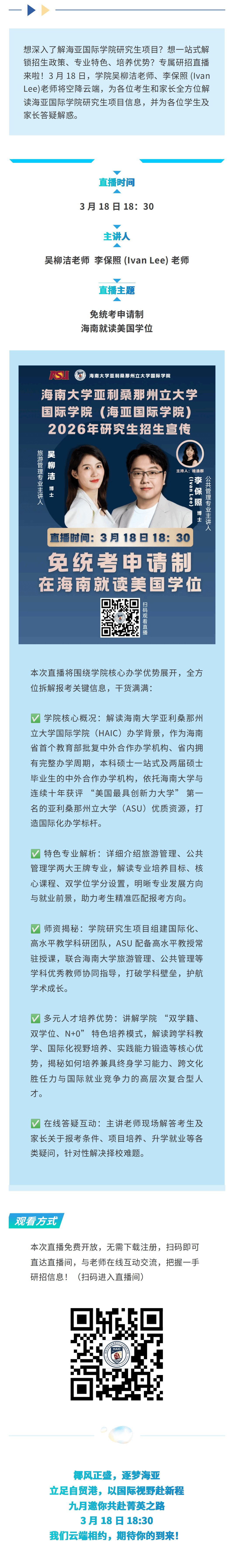 海南大学海亚国际学院研招解读来袭,3.18 云端相约,解锁升学新方向!