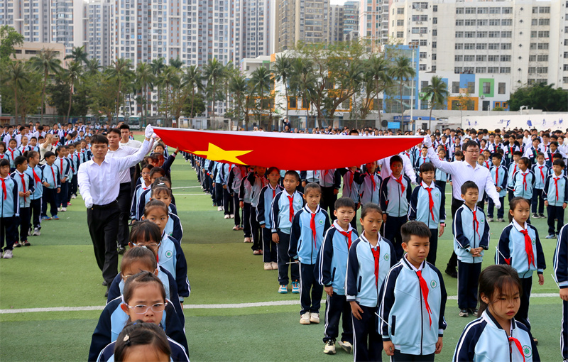 “国旗,是国家的象征和标志,是民族精神与爱国主义精神的集中体现。”省政府教育总督学李渝凤深情寄语师生,要深刻感悟国旗的神圣与厚重,牢记习近平总书记“青春是用来奋斗的”殷切嘱托,在感悟国旗精神中坚定理想信念、厚植家国情怀,积极投身海南自贸港建设的火热实践,努力成长为爱国爱党爱自贸港的坚定信仰者、新时代崇德向善的模范践行者。