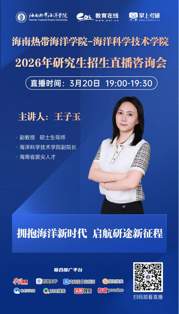 2026考研征程已启,你是否还在为择校迷茫?想深入了解海南热带海洋学院海洋科学专业的科研平台与培养优势?3月20日,海南热带海洋学院海洋科学技术学院联合中国教育在线·掌上考研,在线举办2026年海南热带海洋学院海洋科学专业研究生招生直播宣讲会。招生负责人将亲自解析2026最新政策,带你摸透海洋科学专业的真实培养特色!