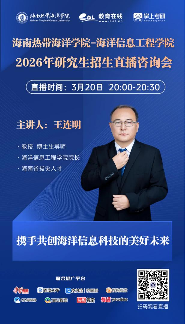 2026考研征程已启,你是否还在为择校迷茫?想深入了解海南热带海洋学院新一代电子信息技术(含量子技术等)专业的科研平台与培养优势?3月20日,海南热带海洋学院海洋信息工程学院联合中国教育在线·掌上考研,在线举办2026年海南热带海洋学院新一代电子信息技术(含量子技术等)专业研究生招生直播宣讲会。招生负责人将亲自解析2026最新政策,带你摸透新一代电子信息技术(含量子技术等)专业的真实培养特色!