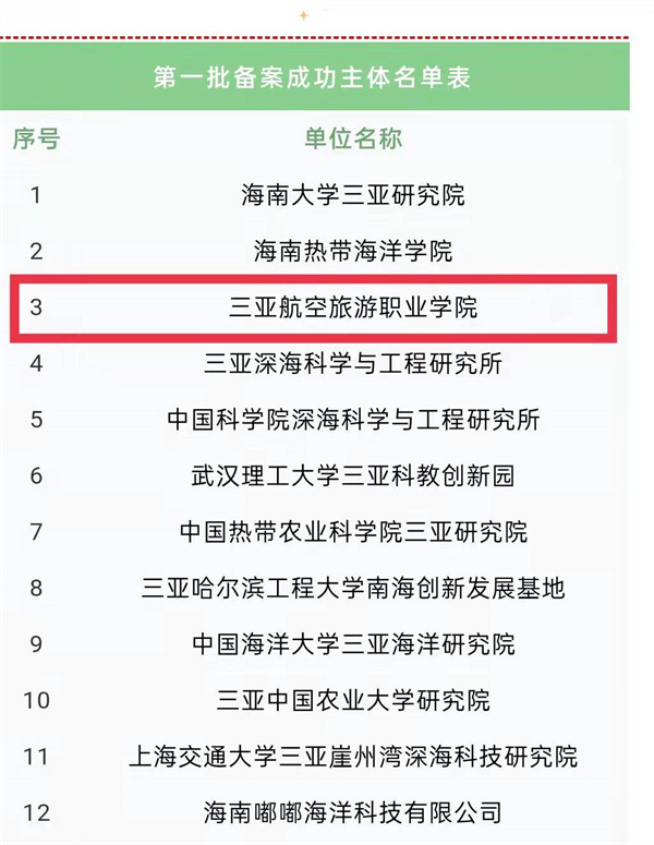 近日,中国(三亚)知识产权保护中心发布了第一批备案成功主体名单的通知,经中国(三亚)知识产权保护中心初审,报国家知识产权局审核,三亚航空旅游职业学院成功获批第一批专利预审服务主体备案单位,此次备案通过的主体单位共29家。
