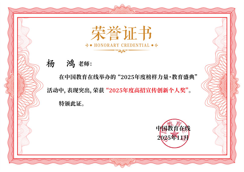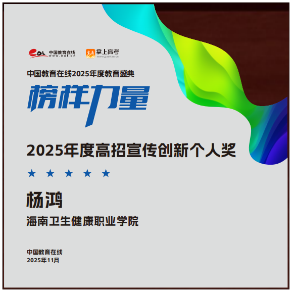 近日,中国教育在线“榜样力量·2025年度教育盛典”优秀案例名单公布。海南卫生健康职业学院杨鸿老师凭借在招录工作中的创新能力和独到见解,获评“2025年度高招宣传创新个人”称号。