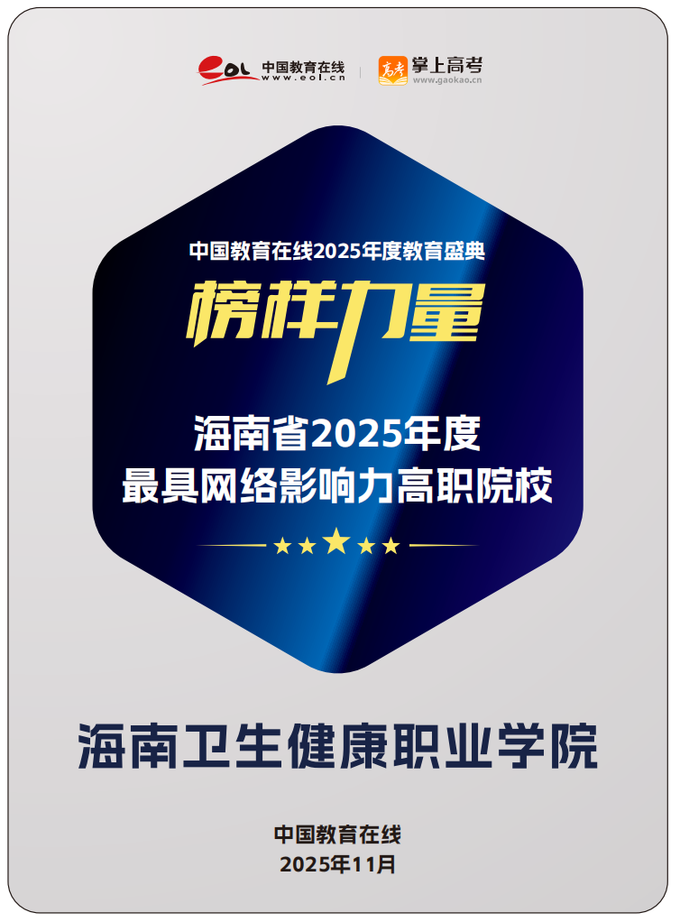 近日,中国教育在线“榜样力量·2025年度教育盛典”优秀案例名单公布。海南卫生健康职业学院凭借极具创新性与前瞻性的招生宣传策略,以及扎实过硬的宣传执行实力,从众多高校中突围,获评“海南省2025年度最具网络影响力高职院校”。