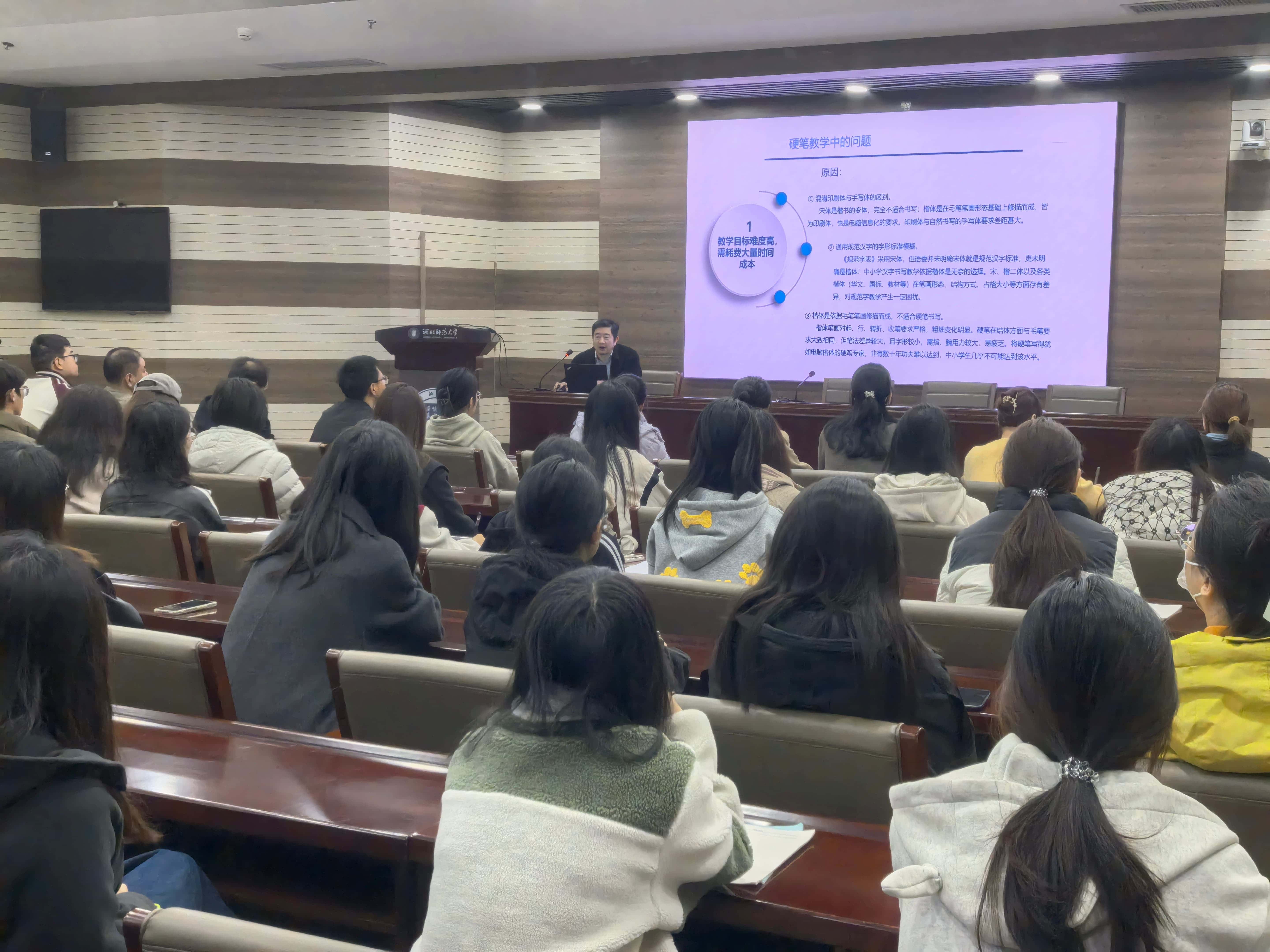 作为活动亮点之一,“公益大讲堂”同期开讲。首都师范大学赵宏教授作题为《规范汉字硬笔教学的发展态势》的专题讲座,围绕“又快又好”书写教学路径展开深入探讨,现场互动热烈,师生反响积极。